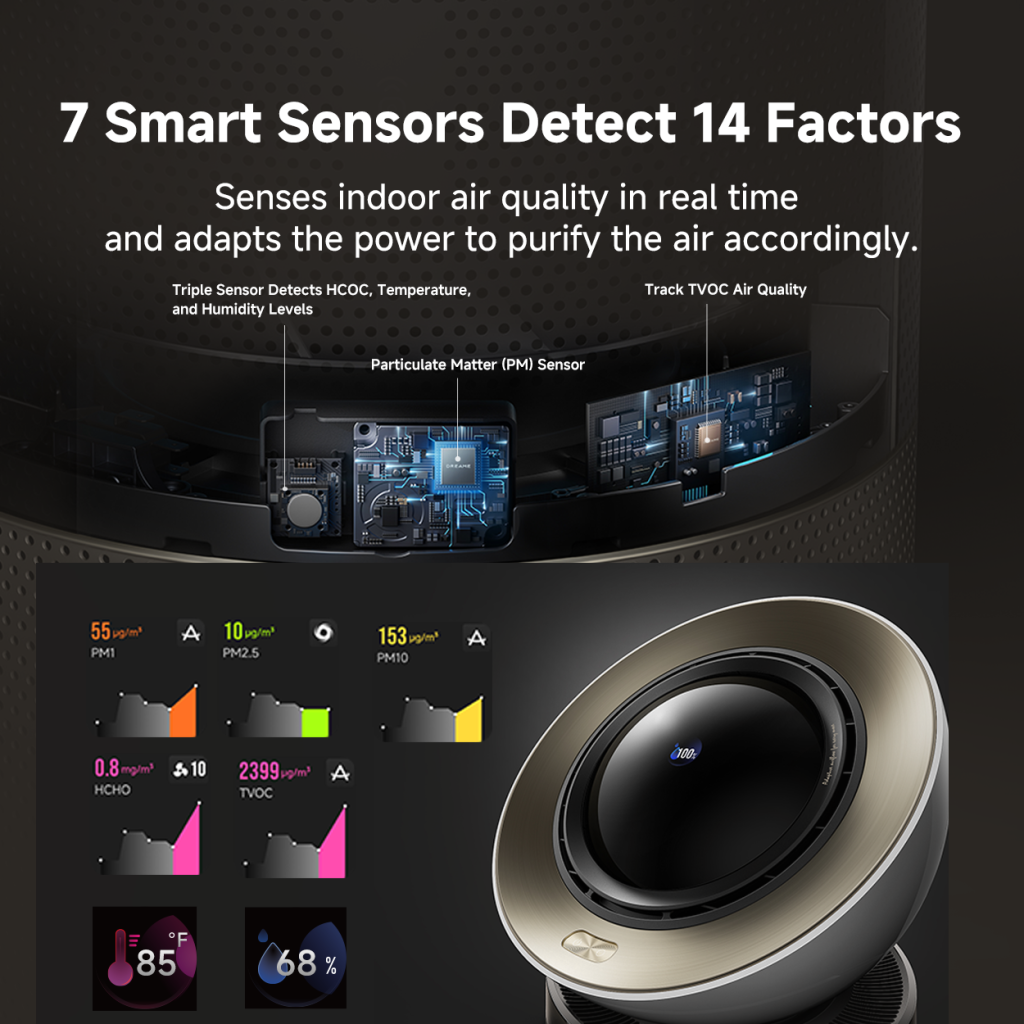 Detects rising pollution and responds instantly—filtering out PM2.5, allergens, viruses, and more, without you lifting a finger.